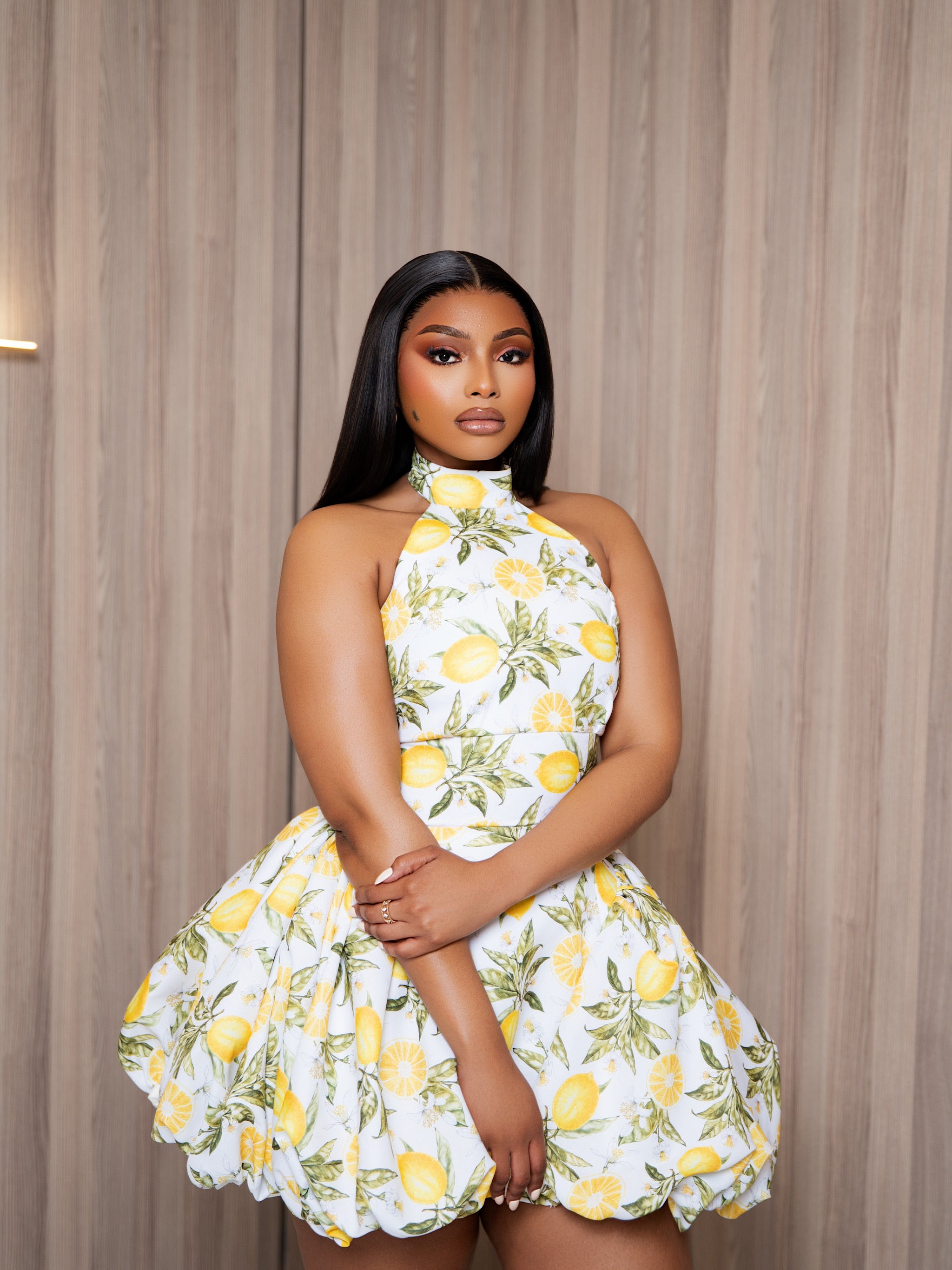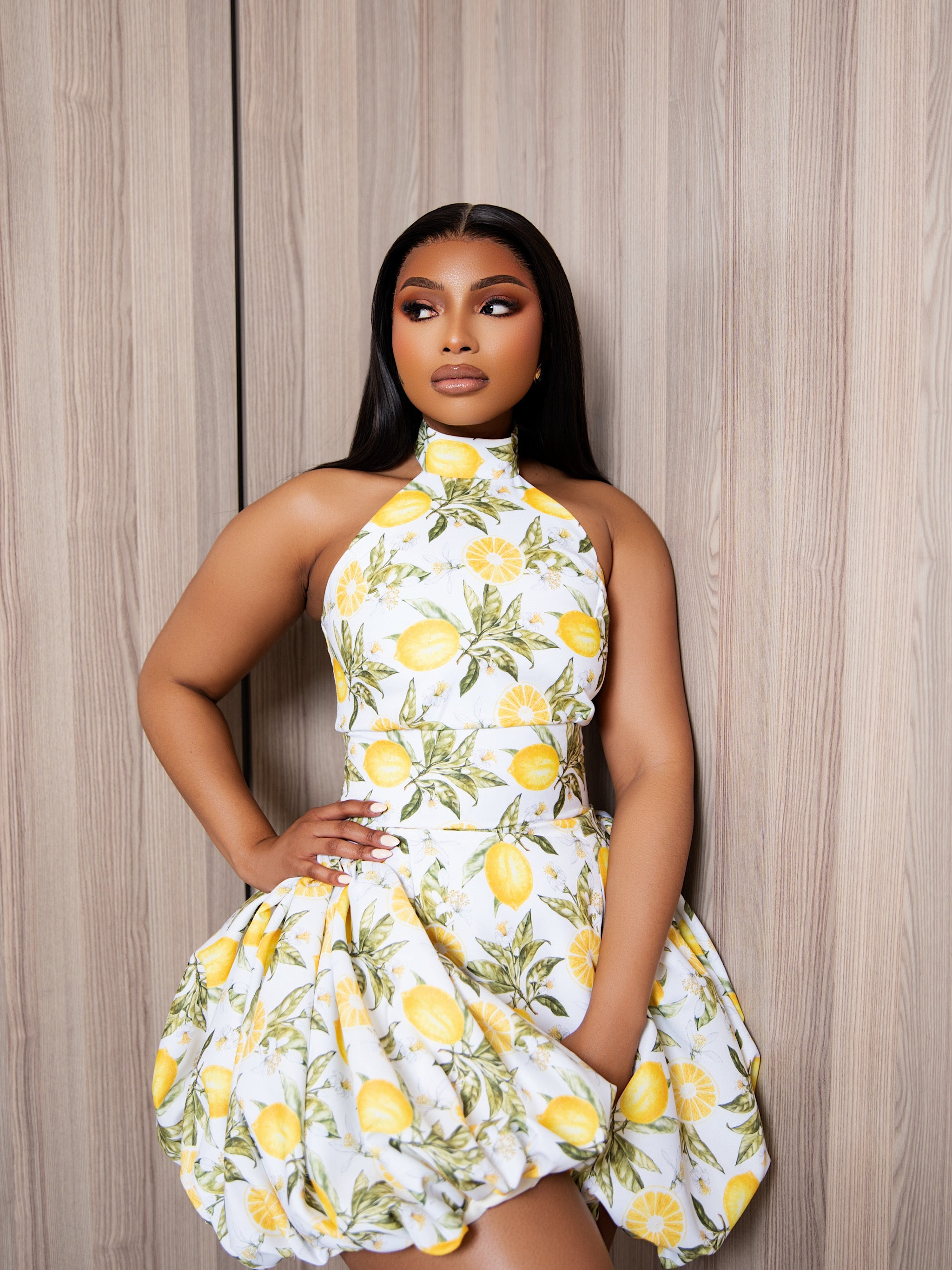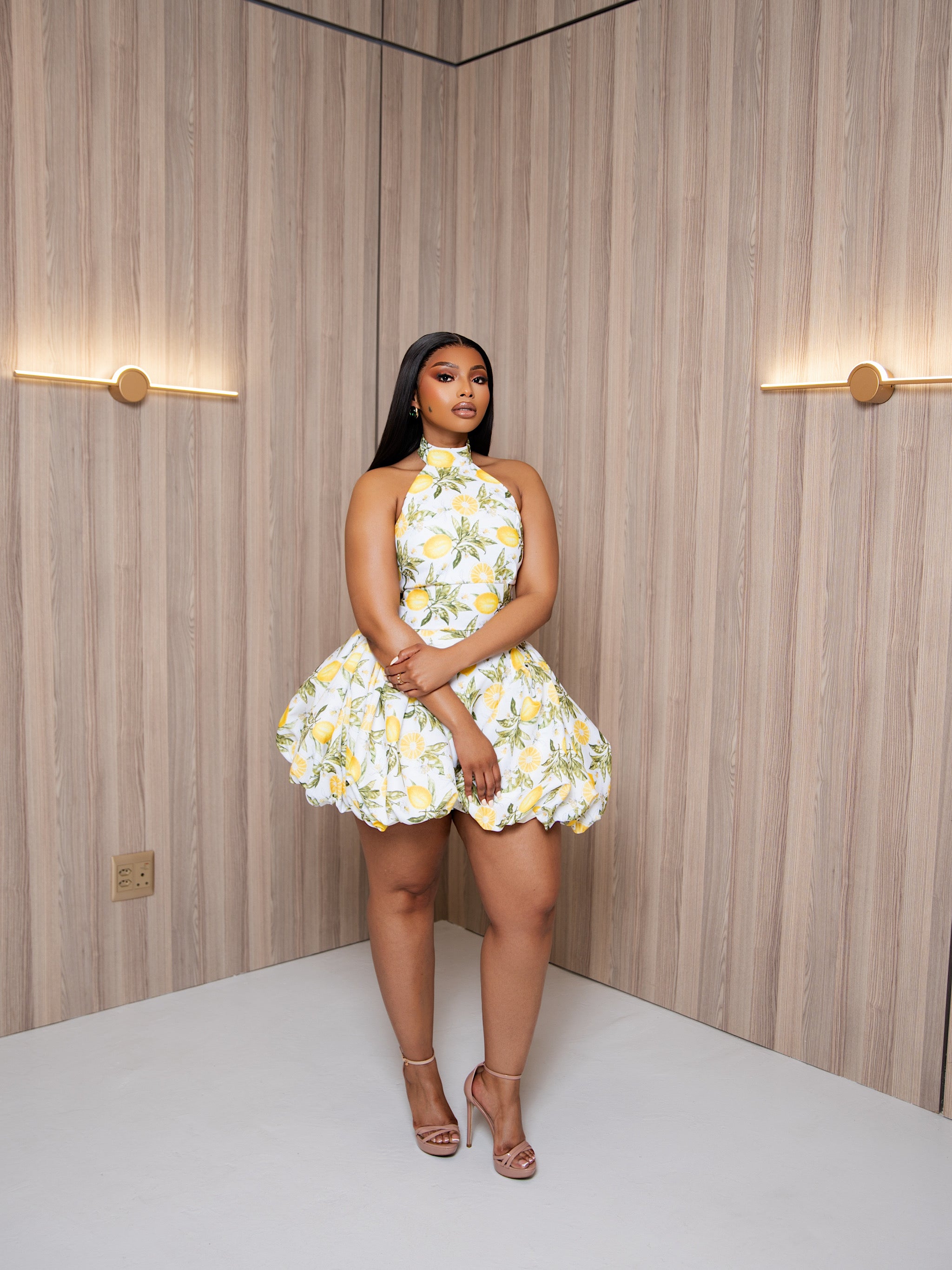 Side panel bubble dress. Mini length. Corset back. Halter neck. Dress length 34-35 inches