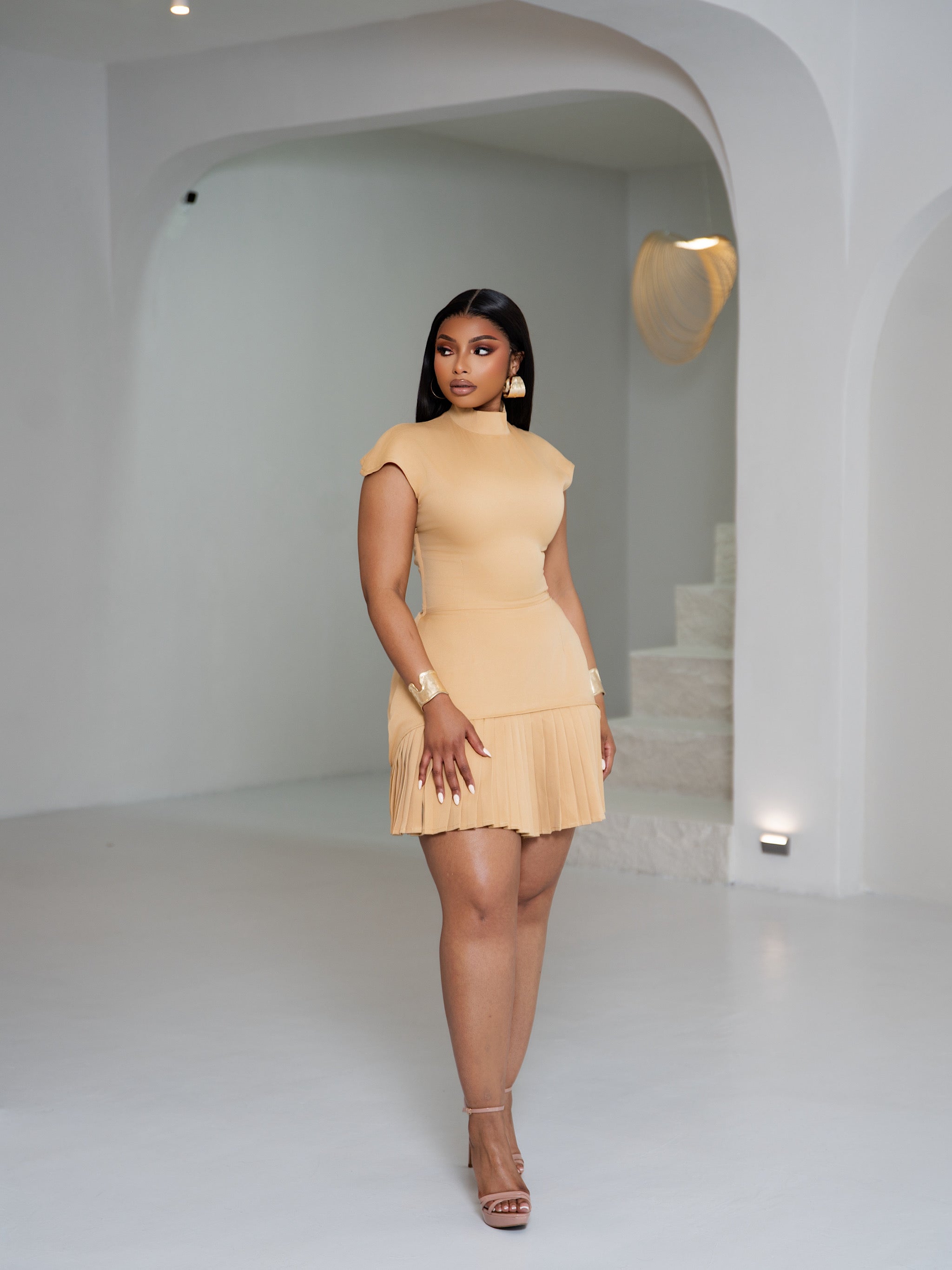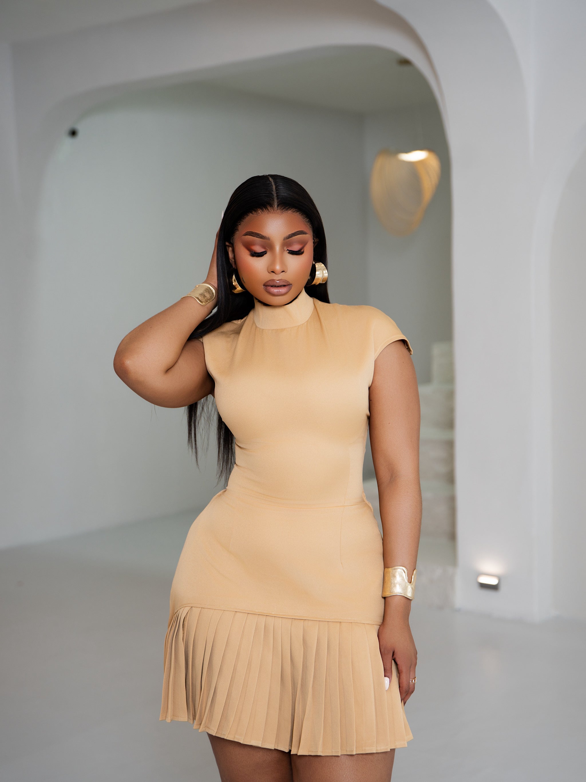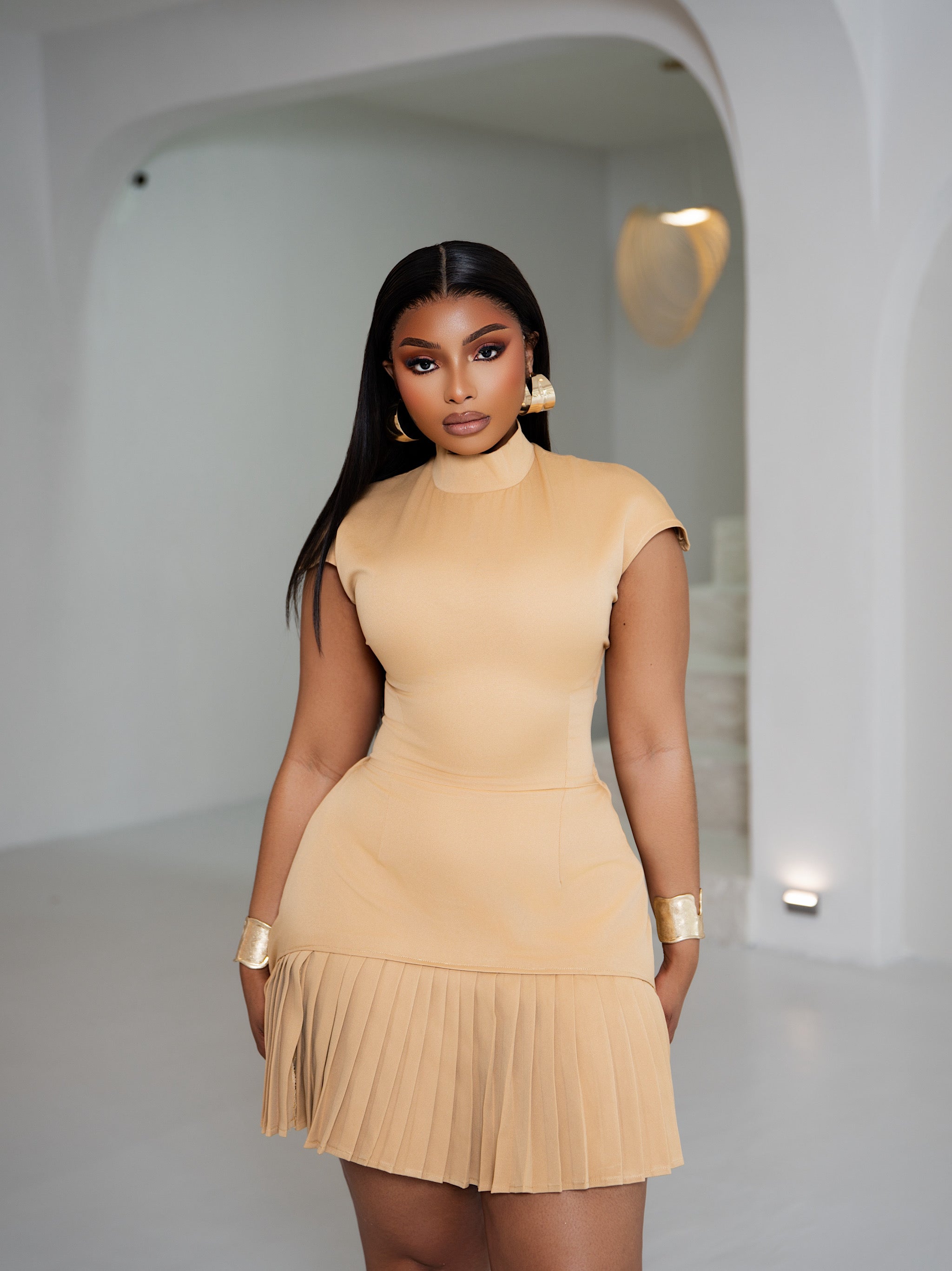 Nude pleated hemline dress. Pleating to the front only, back is a pencil dress fit. Invisible zipper back. Inner corset...