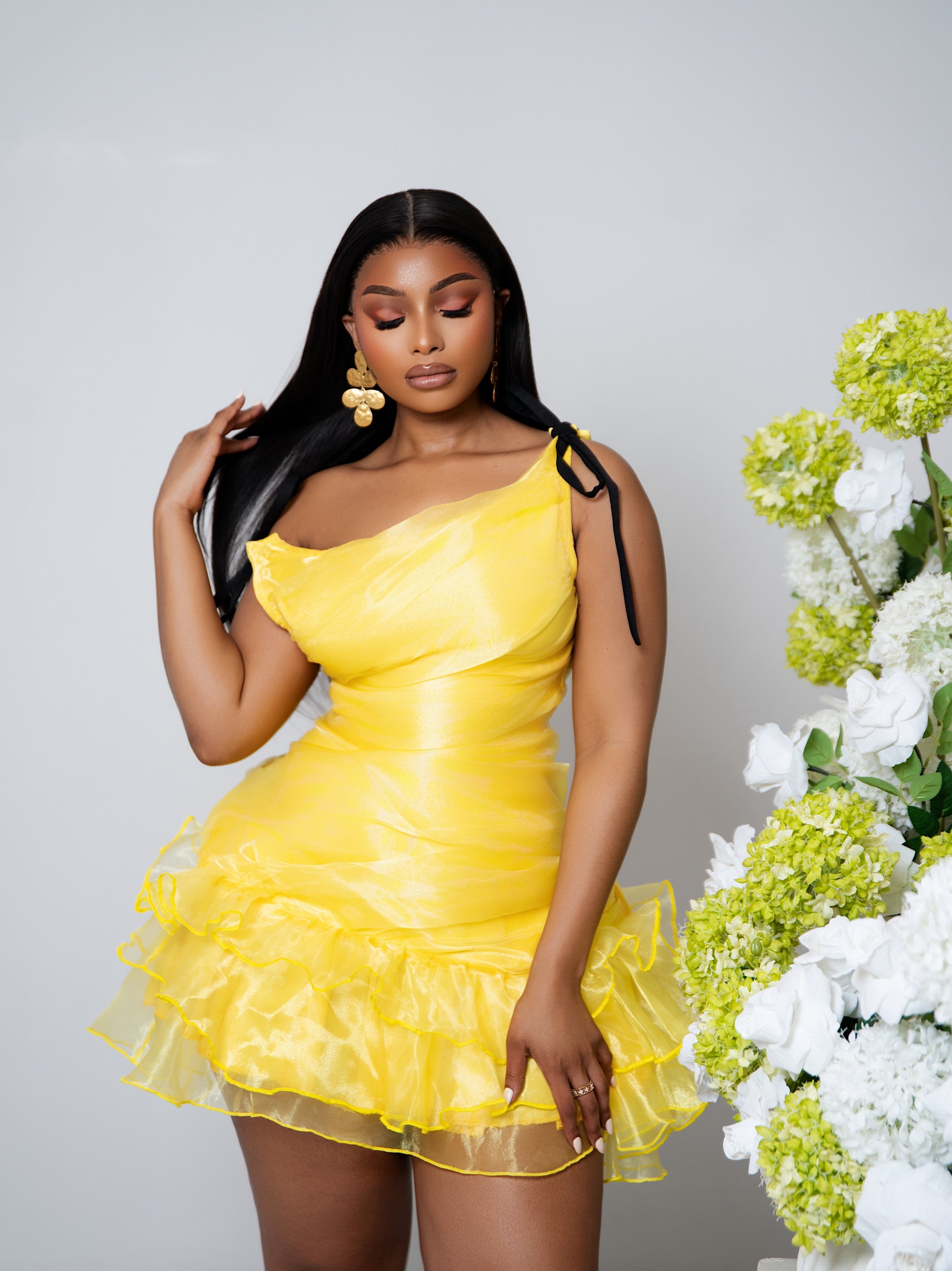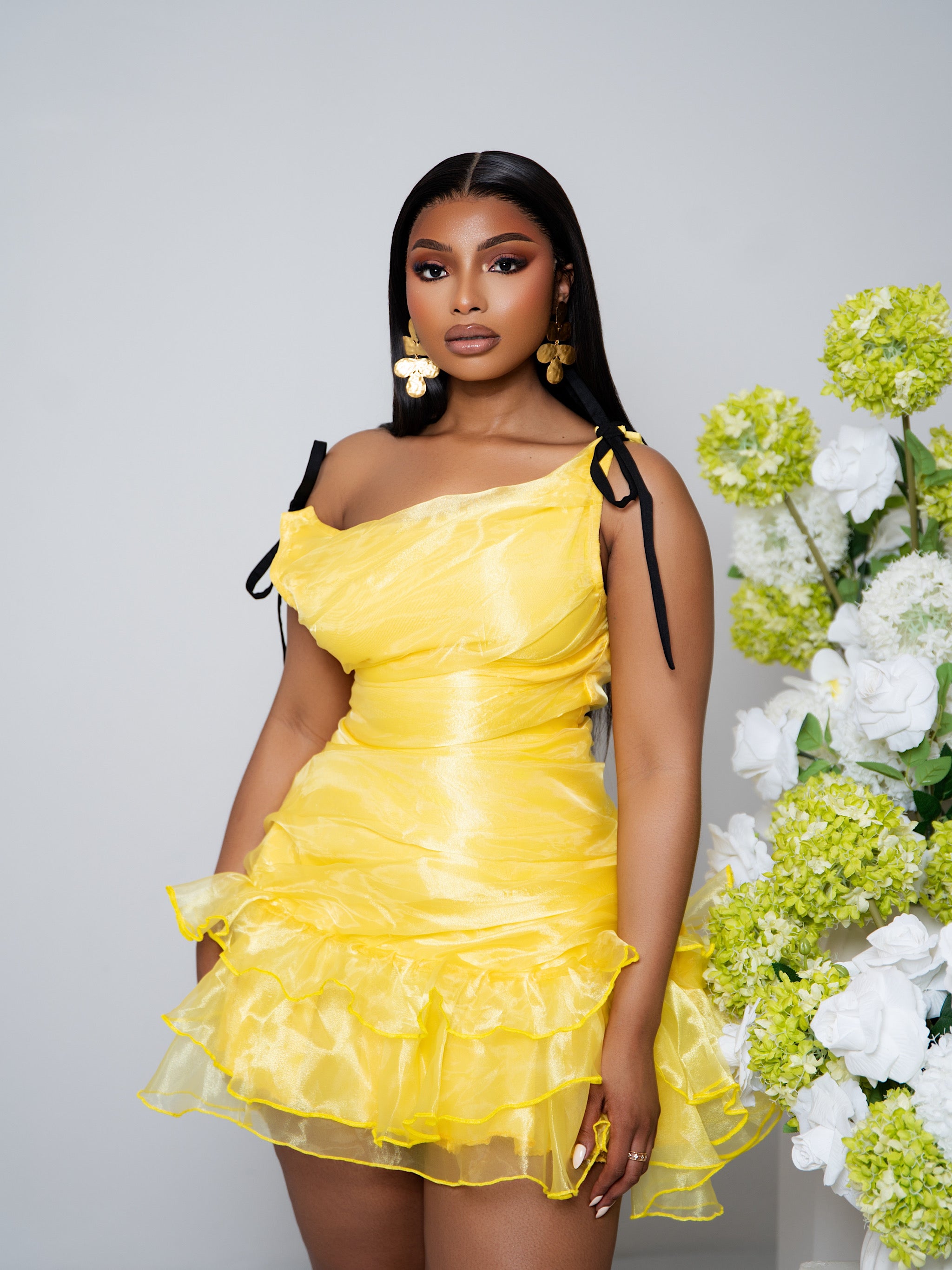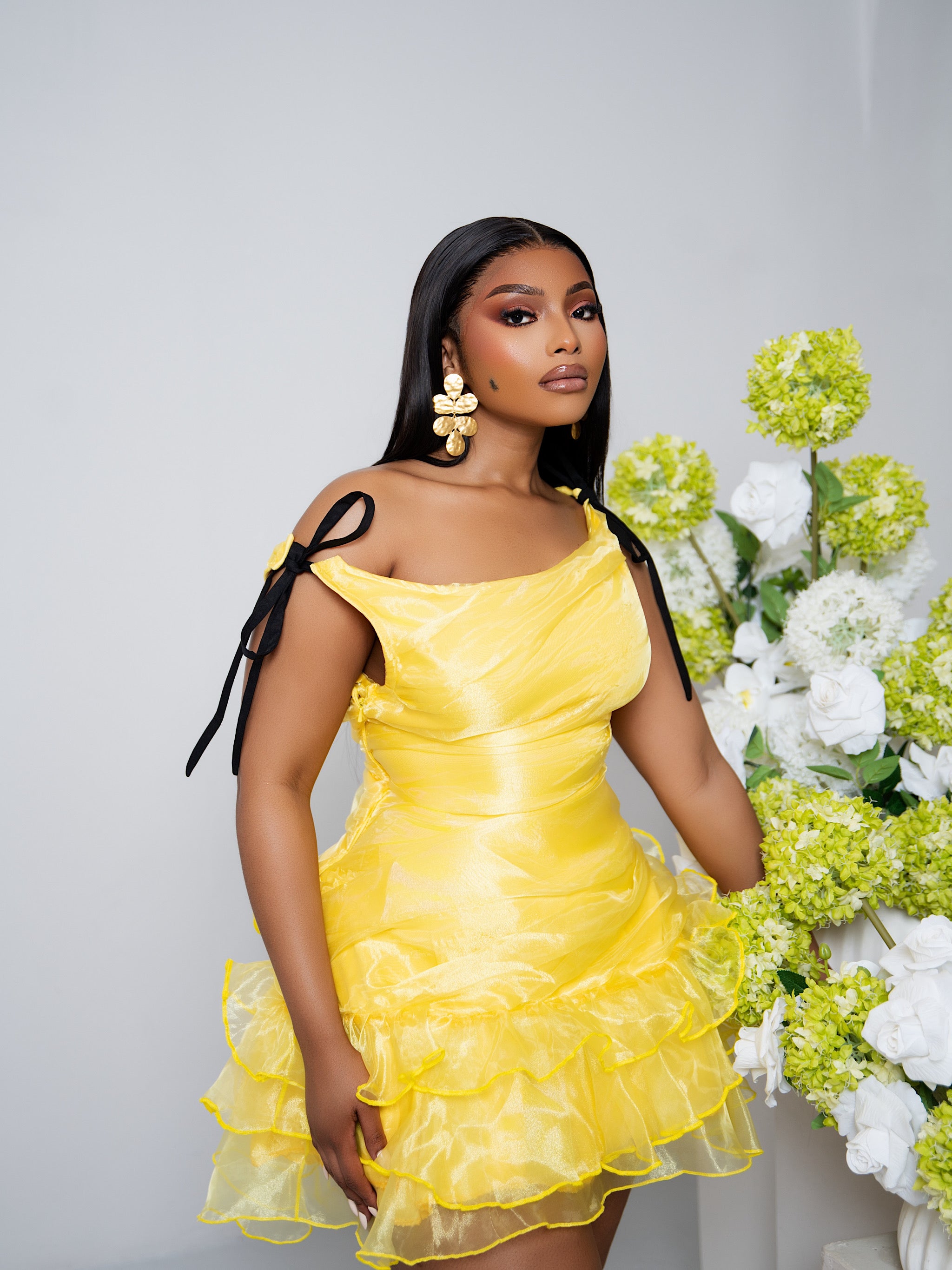 Yellow draped mini with black tie straps. Inner corset belt for waist snatch. Drapping across bodice. Fill bottom detail. Mini...