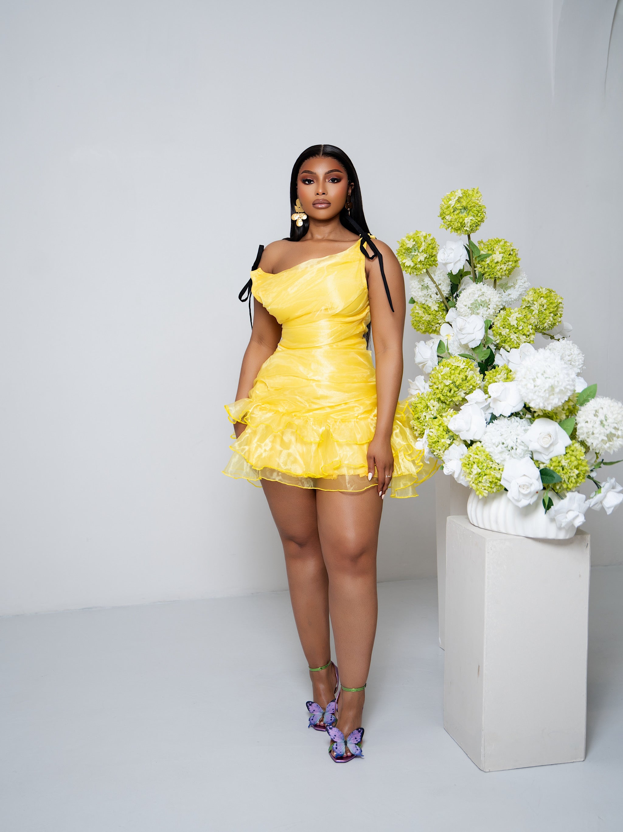 Yellow draped mini with black tie straps. Inner corset belt for waist snatch. Drapping across bodice. Fill bottom detail. Mini...